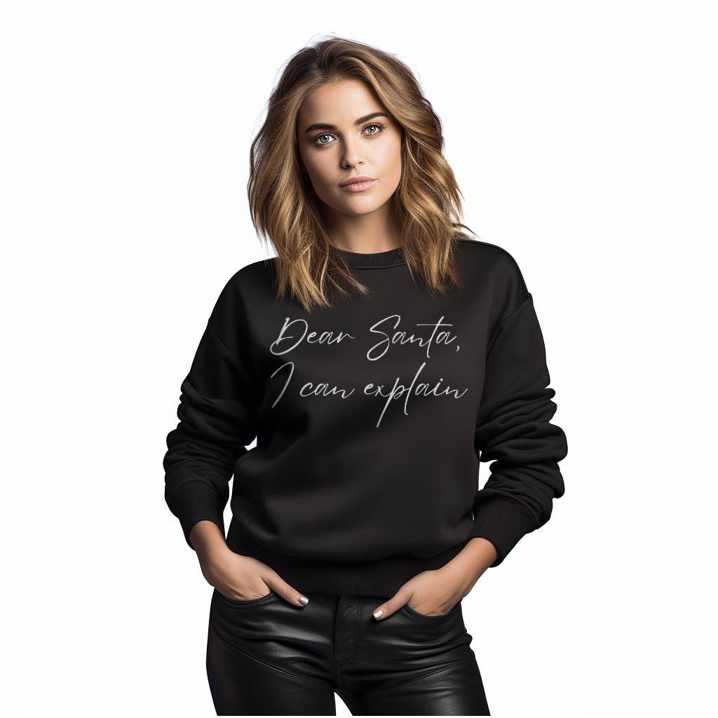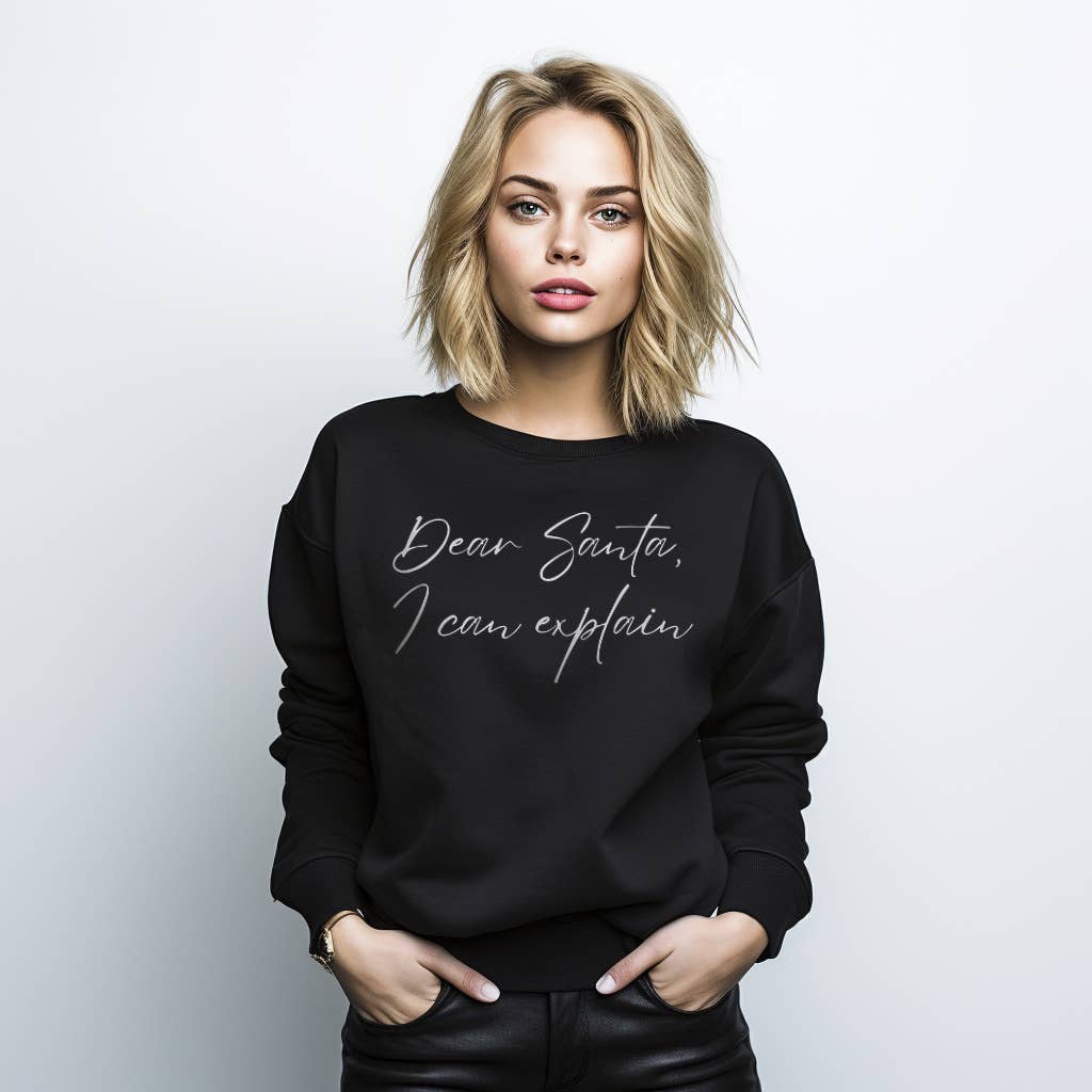 Juodos spalvos džemperis su smagiu užrašu „Dear Santa, I can explain“ – žaismingas pasirinkimas šventiniam sezonui.