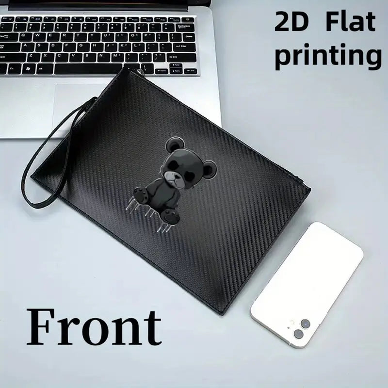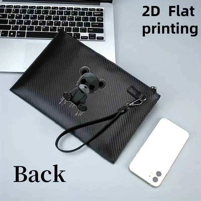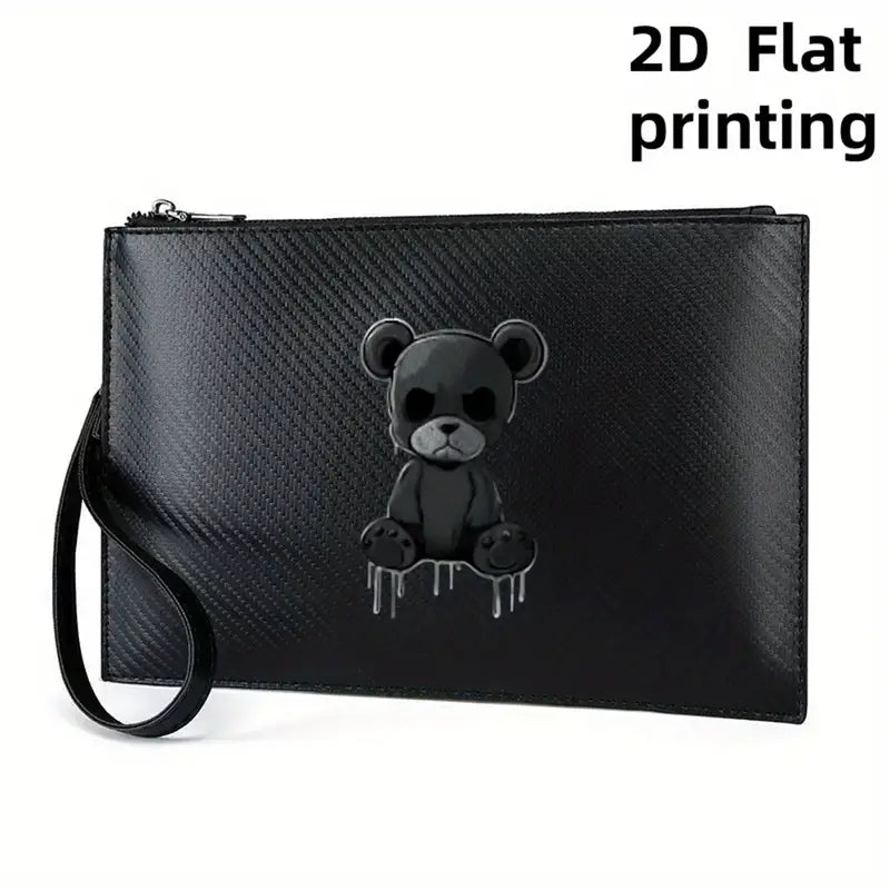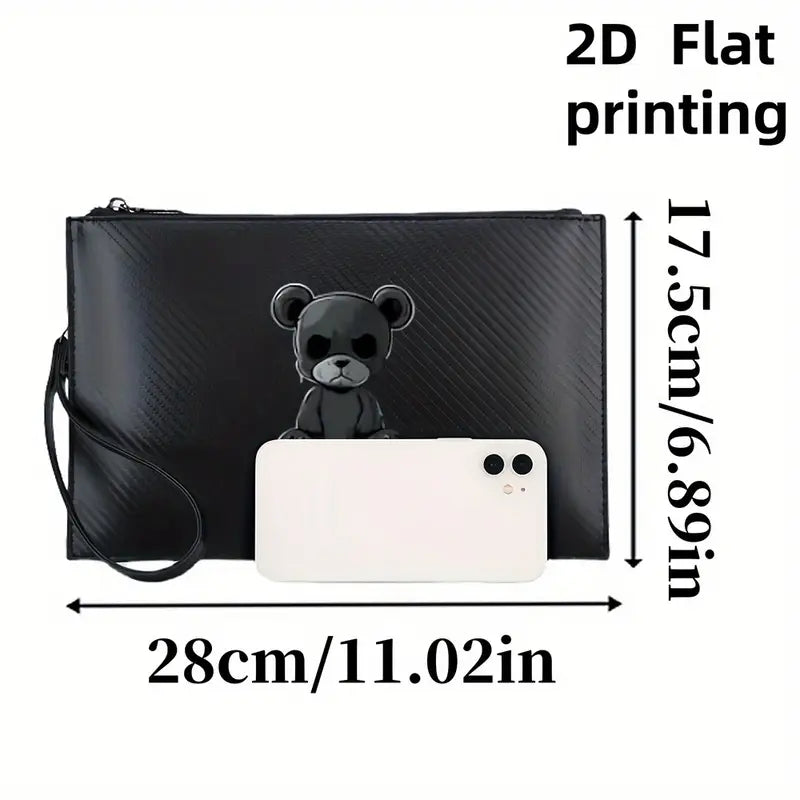 Išskirtinio dizaino juoda delninė, papuošta moderniu 2D plokščiu spaudu – tamsaus meškiuko motyvu.