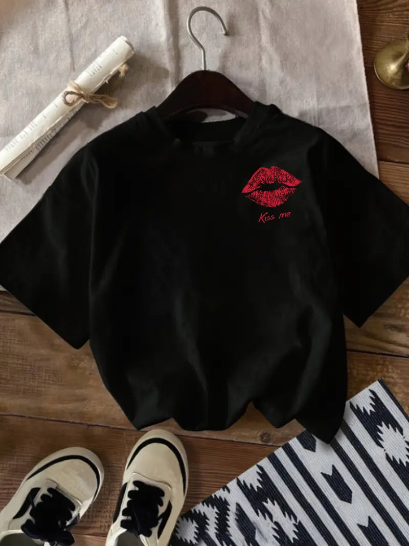Stilingi ir žaismingi trumpomis rankovėmis juodos spalvos marškinėliai su raudonu lūpų spaudo atvaizdu ir užrašu „Kiss me“.