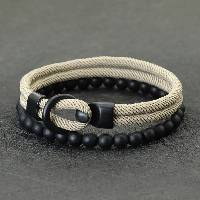 Dvigubas dizainas: pintos virvės apyrankė + matinių juodojo onikso karoliukų juosta