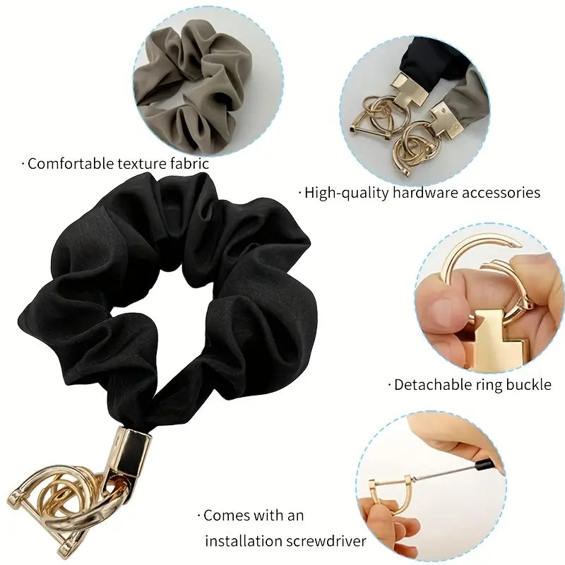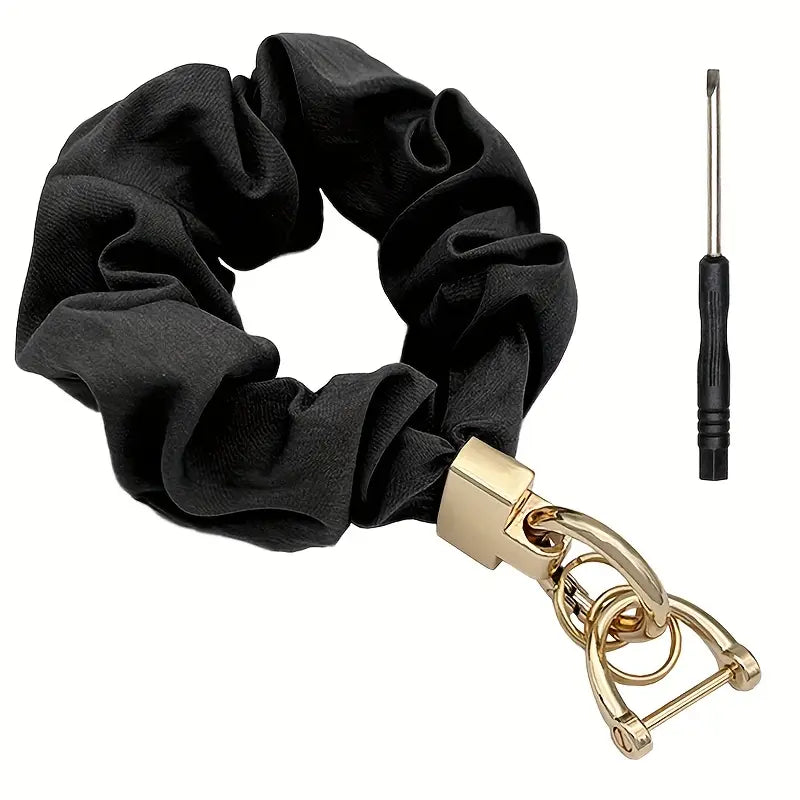 Tai minkšta, juodos spalvos plaukų gumytė, kuri kartu tarnauja kaip patogus raktų laikiklis. Aukso spalvos metalinis užsegimas suteikia elegancijos, o komplekte esantis mažas atsuktuvas leidžia lengvai pakoreguoti ar pritvirtinti raktus.