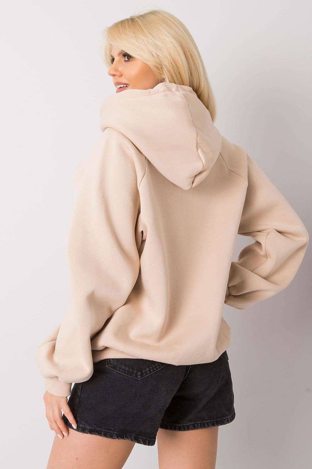 Moteriškas džemperis su ilgomis rankovėmis ir gobtuvu turintis dekoratyvinį užrašą priekyje, kuris suteikia išskirtinumo ir žaismingumo.